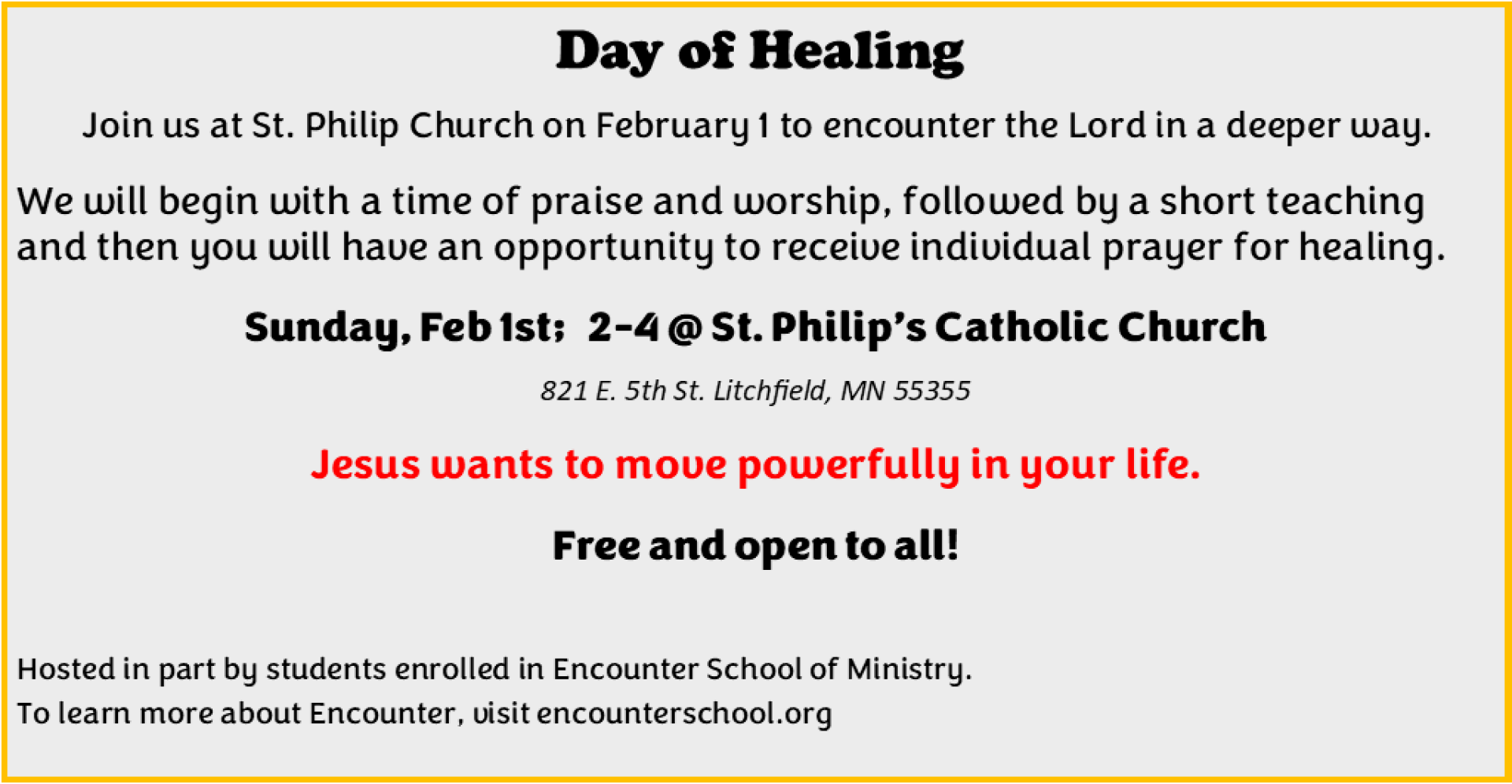 Sunday: 8:00 am St. Philip, Litchfield 8:00 am Our Lady, Manannah 10:00 am St. John, Darwin 10:00 am St. Anthony, Watkins 12:00 pm St. Philip, Litchfield (Spanish)